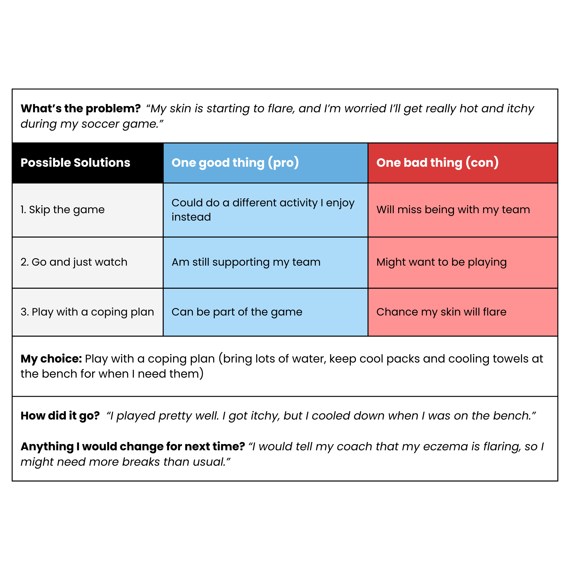Tip: As you are problem solving, only include solutions that are realistic or beneficial. Your child may suggest solutions like “make my eczema go away forever” or “quit the soccer team,” even though soccer is something they enjoy. Gently encouraging them to think of other solutions may give them some control over their current problem. “I wish we could make your eczema go away forever, what is something we could do about this soccer game?”